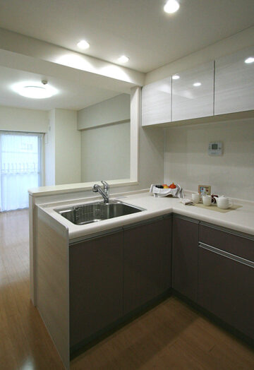 間口が狭く細長いLDKの場合はL型のキッチンを取り入れても良いですね。